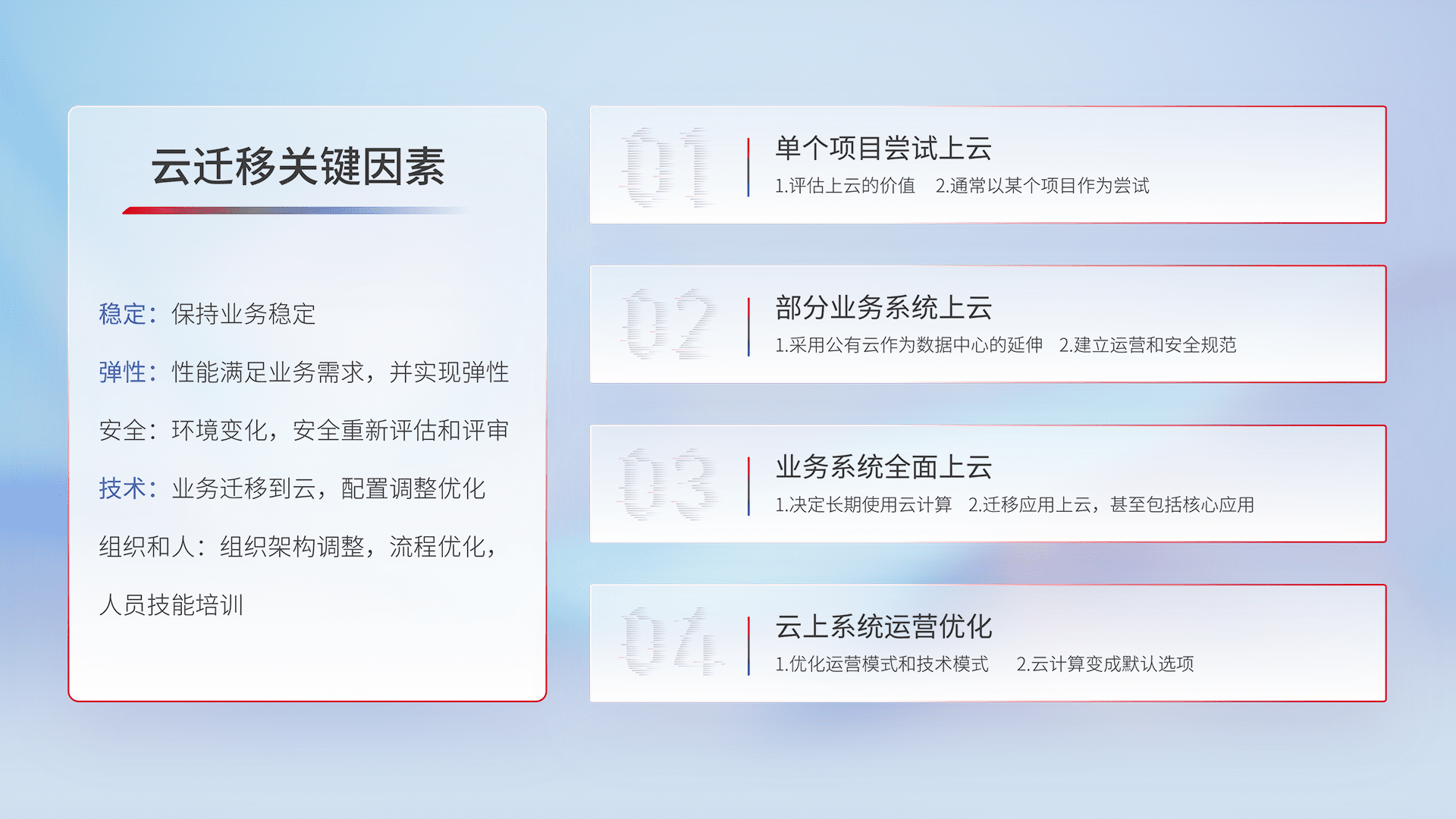 结合实际业务,,从规划设计、、云平台选型、、、、云原生改造、、、、数据迁移、、、、集成交付,,,迁移全过程为客户识别最佳上云路径,,做好风险识别管理,,设计网络架构、、身份权限、、、、安全审计合规、、、操作审计、、日志审计、、、监控告警策略、、、多站点容灾设计等,,,对云上基础设施进行整体规划,,提升IT治理水平,,,,以满足弹性、、、高可用、、高性能的需求。。。。